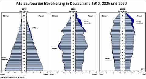 Die Form der Bevölkerungspyramide hat sich deutlich verändert: Die bevölkerungsstärksten Jahrgänge sind in immer stärkerem Maße im höheren Alter anzutreffen. Der Autor Roland Tichy hat ein Buch zum Thema deshalb treffender Weise "die Pyramide steht Kopf" betitelt.