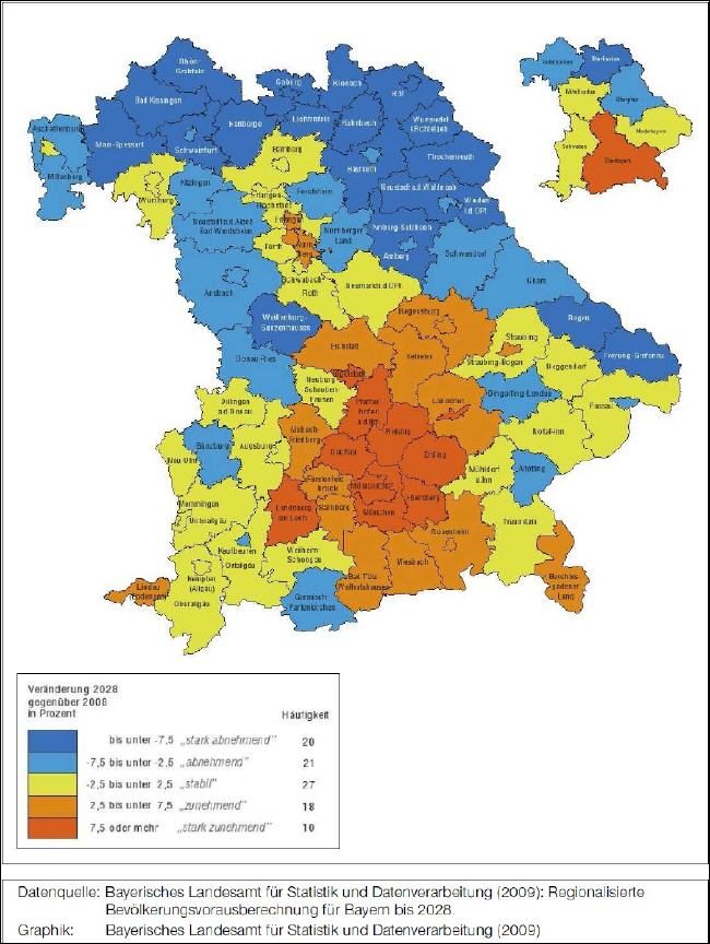 Von dieser allgemeinen Beschreibung der gesamtbayerischen Verhältnisse abgesehen, ermöglicht die regionalisierte Vorausberechnung des Landesamtes aber natürlich auch die stadt- und landkreisspezifische Betrachtung der Bevölkerungsentwicklung. |