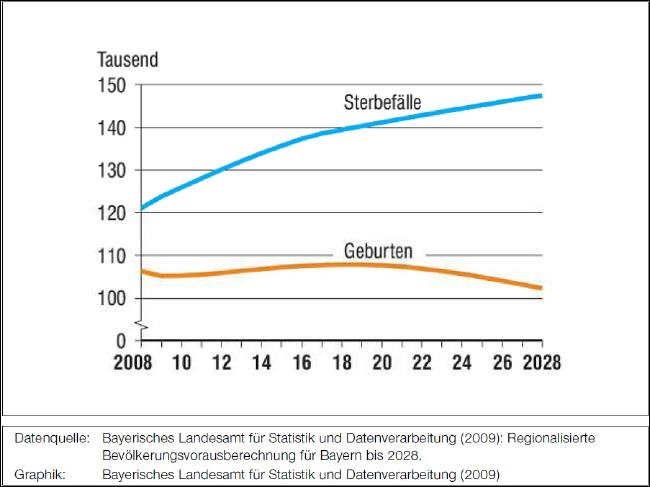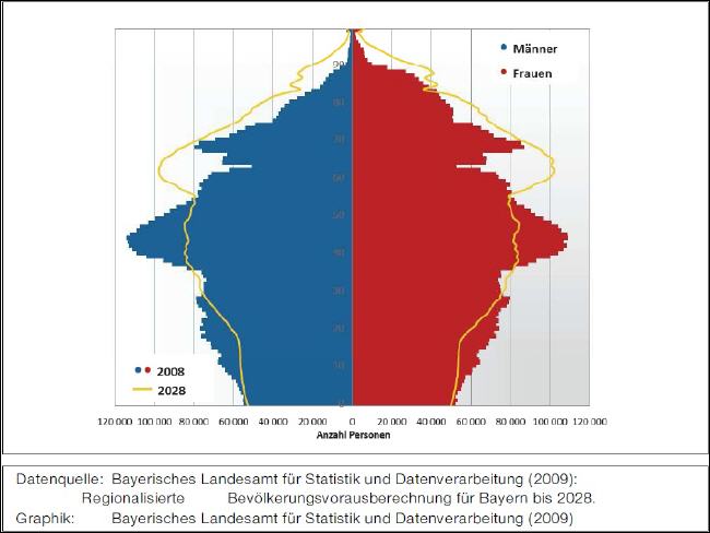 Um die Ergebnisse der Bevölkerungsprognose für den Landkreis besser einordnen zu können, wird nachfolgend kurz auf die zukünftige Bevölkerungsentwicklung in Bayern eingegangen, da der Freistaat wie oben dargestellt im Vergleich - insbesondere zu den neuen Bundesländern - immer noch mit wesentlich geringeren Bevölkerungseinbußen rechnen muss. Die Ergebnisse der regionalisierten Bevölkerungsvorausberechnung für Bayern bis 2028 besagen, dass die Bevölkerung, ausgehend von ihrem aktuellen Stand von rund 12,52 Millionen, bis 2014 zunächst um etwa 400.000 Einwohner ansteigt, um dann bis 2028 auf Ausgangsniveau zu schrumpfen. Was zunächst noch wenig dramatisch klingt, entpuppt sich bei näherer Betrachtung jedoch als durchaus problembehaftet, da die zahlenmäßig sehr starke Babyboomer-Generation von der Erwerbsfähigkeit in die Ruhestandsphase übergeht, während ihre Kinder und Kindeskinder sich nicht mehr ausreichend, sprich mit über zwei Kindern pro Frau, fortpflanzen. |