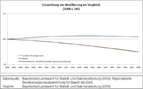 Der erwartete Rückgang hält sich im Vergleich zu anderen Regionen Deutschlands allerdings noch in Grenzen. Auch in Franken gibt es Gebiete, denen eine deutlich schlechtere demographische Prognose gestellt wird als dem Landkreis Nürnberger Land. Die Attraktivität der Lebensverhältnisse mit einem Zugang zu Arbeitsplätzen im Großraum Nürnberg und eine gute Verkehrsanbindung sind die Grundlagen für eine nicht noch gravierendere Entwicklung.